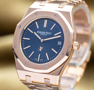 Grail alert! Up for sale or trade is the Royal Oak ‘Jumbo’ with the highly desirable blue dial against exquisite rose gold. It’s housed in an insanely finished 18-carat gold case and matching bracelet finished to the highest quality AP knows how to do. This piece comes with the original bracelet, so it is NOT a converted bracelet watch...this is the real deal from AP. The rose gold bracelet complements the case beautifully, creating a cohesive and sophisticated look. Each element of this timepiece, from its polished surfaces to its intricate details, reflects the brand’s commitment to excellence.