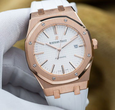 Up for sale or trade is the Royal Oak in exquisite rose gold and the stunning silver dial! A complete full set with box and all the warranty paperwork. The watch is housed in an insanely finished 18-carat gold case, which contrasts beautifully against that silver dial. Choose between a white rubber, black rubber or black leather strap. Don’t miss your chance to grab it while you can!