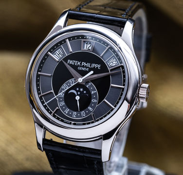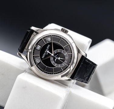 Grail alert! The Patek Philippe Annual Calendar - a watch to separate you from the crowd once and for all! The 5205G features a sleek 40mm white gold case, and the black crocodile strap with the white gold buckle pairs just perfectly. The stunning black dial also adds a touch of sophistication, beautifully complementing the case. The dial is also equipped with an annual calendar complication, displaying the day, date, and month, along with a moonphase indicator. The calendar complication only requires adjusting once a year - super convenient and cool! The time has finally come to get the one you’ve wanted! This is a classic you know you want in your collection!