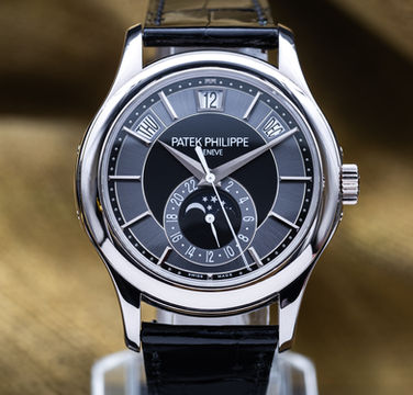 Comes as a full set with all the original inner and outer boxes and all manuals/booklets, and origin papers (warranty) dated from 2012 purchase. Also comes with the white gold annual calendar and moonphase pusher tool. Watch is in complete working order, running very strong, and keeping great time. The case, crystal and buckle are in great condition with only very minor signs of wear (unpolished). Don’t miss your chance to get this Patek while you can!
