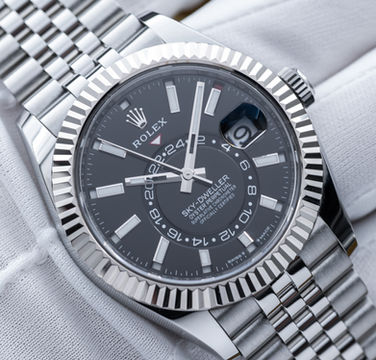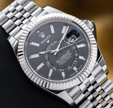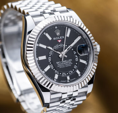 This Sky-Dweller in stainless steel with the white gold fluted bezel and black dial is Rolex’s idea of a first-class travel companion. At 42mm, it’s bold without being over the top, and that crisp white gold bezel catches the light beautifully. The dial houses the impressive layout - dual time zones displayed with an off-center 24-hour ring, plus an annual calendar that automatically adjusts for months with 30 or 31 days. All of it is run by Rolex’s in-house calibre 9001, one of their most complex and capable movements. It’s sporty enough to wear with a polo, but polished enough to sit under a suit cuff - making it a true “go anywhere, do anything” piece.