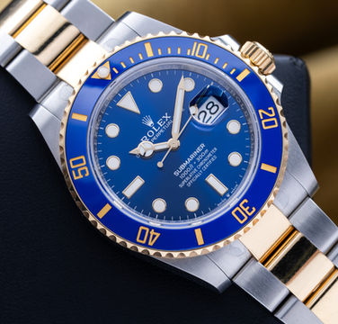 The Rolex fan favorite blue dial and bezel two-tone Submariner date, or better known as the “Bluesy”. One of the best color combos Rolex has ever come out with. These things just pop off the wrist and stand out. This is the newer 41mm model you’ve been looking at, so come grab it while you can!