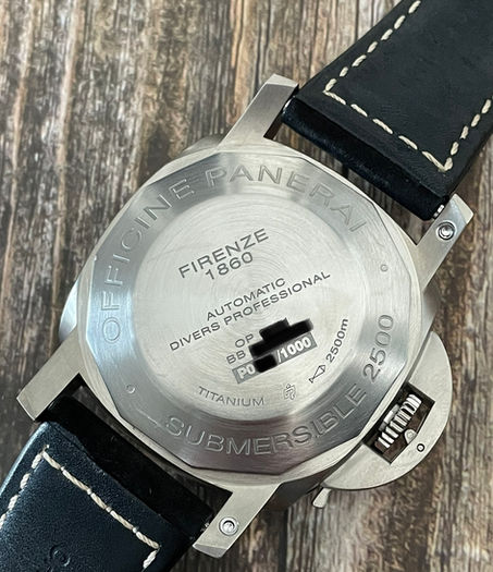 The rare 2500 version of the Submersible...you won’t see many of these on the pre-owned market! This one is a limited edition of only 1000 pieces, and with its brushed titanium case and bezel with the unmistakable submersible dial, helium escape value and of course the famous crown guard, it has everything you want in your Panerai! This thing has some serious wrist presence...and it should for a water resistance rating of a staggering 2500 meters (over 8000 feet!) to protect the beautiful 3 days power reserve in-house movement. It is what Panerai does best, their Submersibles are their finest diving watch line and you can see why.