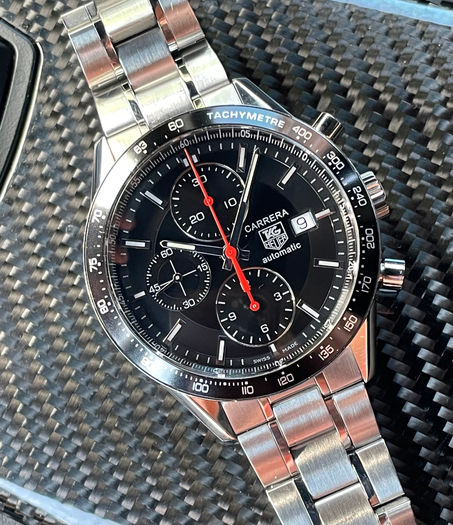 Beautiful sports racing watch. Amazing detail in the dial and a see-through case back to enjoy the Calibre 16 automatic chronograph movement. A sporty watch yet luxurious enough to dress up. It looks great on all sorts of straps as well!