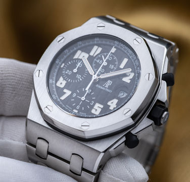 Up for sale is this stunning AP Royal Oak Offshore “Black Themes”. The beautiful brushing on the bezel, offshore rubber gasket, and of course a black dial featuring white gold hands, Arabic numerals and the Mega Tapisserie made famous in these watches. The 42mm case adds to its desirability due to it being the most wearable size for most wrists. Come and make it your today!