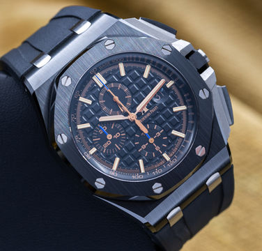 Up for sale is this beautiful AP Royal Oak Offshore in a full black ceramic case that AP does so well! The gold hour markers contrast beautifully against the black Mega Tapisserie-patterned dial. The dial also features royal blue contrasting accents on all the chronograph hands, which really pop in the flesh. This piece blends sportiness with luxury and is a favorite of all watch enthusiasts. Grab it while you can!