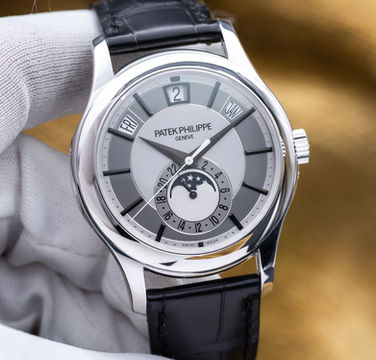 Grail alert! The Patek Philippe Annual Calendar - a watch to separate you from the crowd once and for all! The 5205G features a sleek 40mm white gold case, and the black crocodile strap with the white gold buckle pairs just perfectly. The stunning silver dial also adds a touch of sophistication, beautifully complementing the case. The dial is also equipped with an annual calendar complication, displaying the day, date, and month, along with a moonphase indicator. The calendar complication only requires adjusting once a year - super convenient and cool! The time has finally come to get the one you’ve wanted! This is a classic you know you want in your collection!