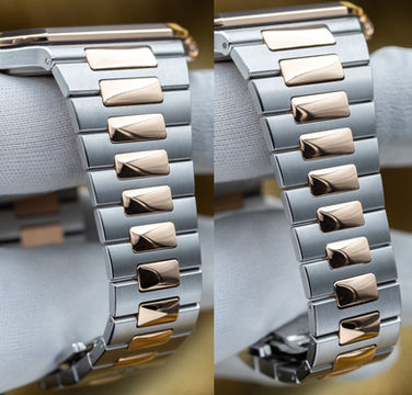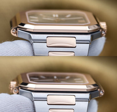 The Patek Philippe Cubitus 5821/1AR-001 is a bold yet refined twist on the modern luxury sports watch. Its two-tone construction - stainless steel paired with warm 18k rose gold - gives it that perfect balance between casual sophistication and quiet flash. It features a unique cuboidal shape that sets it apart from traditional round models, offering a modern yet timeless aesthetic. The sunburst deep blue dial, accentuated by gold-applied hour markers and hands, provides a sophisticated contrast to the mixed-metal case. With a blend of refined design and contemporary materials, this is a standout piece for those who appreciate Patek Philippe’s dedication to craftsmanship and innovative design language.