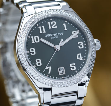 The Patek Philippe Twenty~4 is a stunning ladies' piece that blends everyday wearability with serious high-end craftsmanship. The design is all about timeless class: a round case, beautiful clean dial and stunning diamond-set bezel for that subtle sparkle. Inside, it’s powered by Patek’s in-house automatic movement, which you can admire through the sapphire caseback. This refined and chic timepiece seamlessly combines beauty and practicality, making it perfect for every occasion.